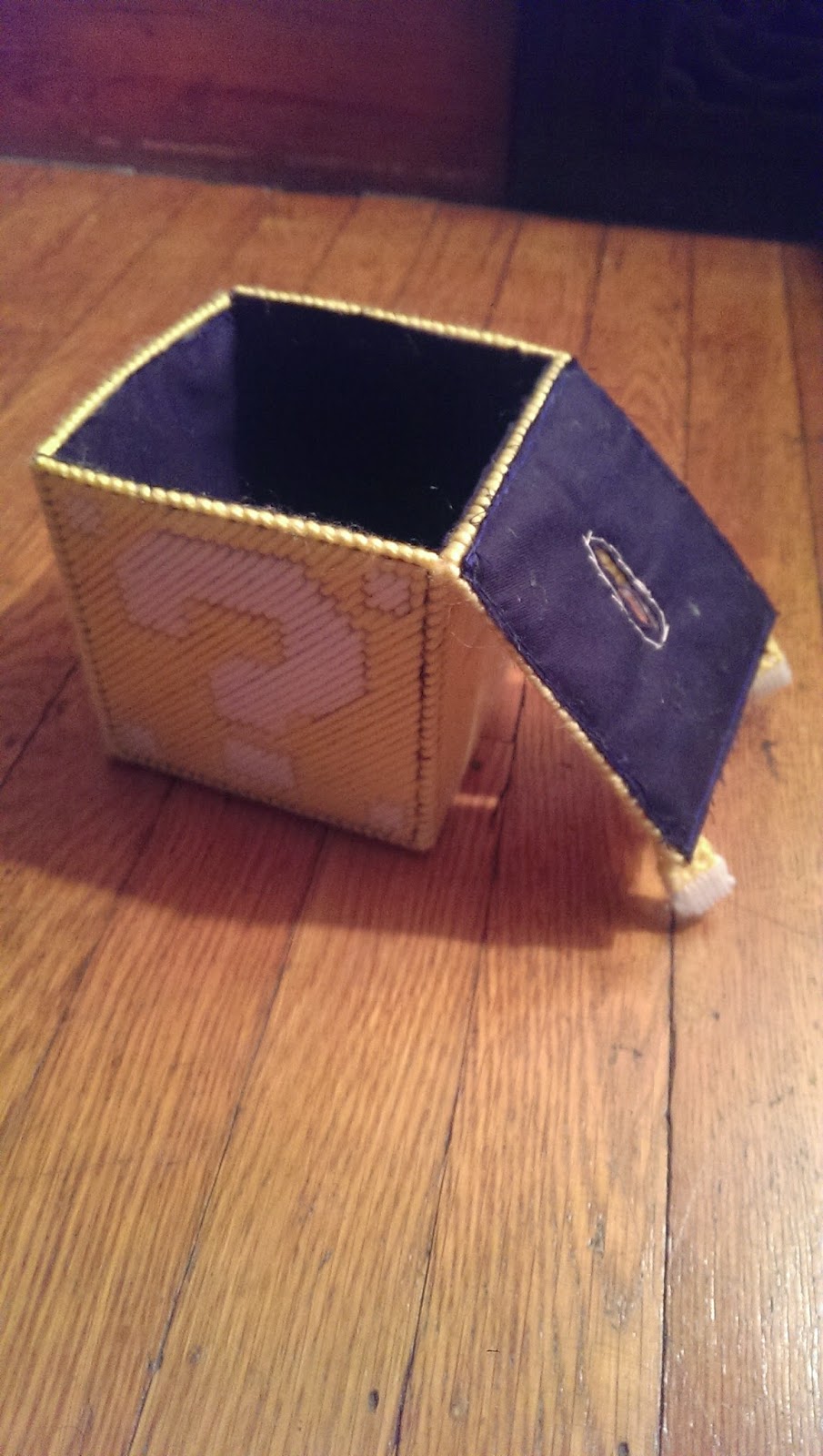 I have some plans for what I wish to get up to tomorrow. As I said, I was going through my bins of craft supplies and found some odds and ends of plastic canvas pieces. A bunch of squares that I have no idea what I was going to do with. Then it hit me - or rather, I hit it - A Mario coin block piggy bank! (See what I did there, with that pun? ;D)